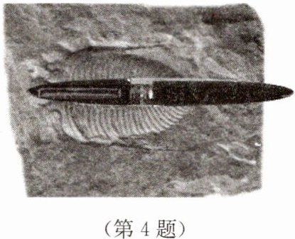 4. “这么近,那么美,周末到河北”。嘉嘉周末到弘济桥游览,发现青石桥面上有三叶虫化石,他想了解其长度,在化石旁放了一支笔拍下照片(如图)。回家后量出照片上笔和化石的长度分别为$7\ cm$和$4\ cm$,笔的实际长度为$14\ cm$,则该化石的实际长度为(