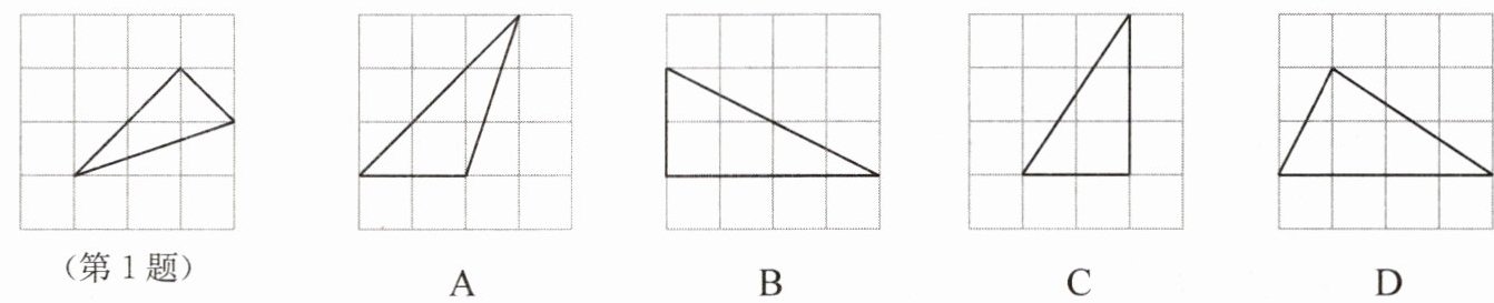 1. 在大小为 $4×4$ 的正方形网格中,下列四个选项中的三角形,与左图中的三角形相似的是(