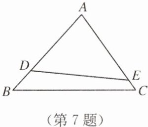 7. 如图,已知点 $D$,$E$ 分别在 $AB$,$AC$ 上,$∠ ADE=∠ C$,$△ ADE$ 与 $△ ABC$ 相似。