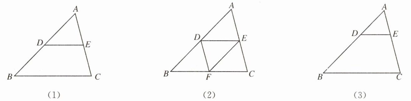问题 如图(1),在 $△ ABC$ 中,点 $D$,$E$ 分别是 $AB$,$AC$ 边的中点。$△ ADE$ 与 $△ ABC$ 相似吗?请说说你的理由。