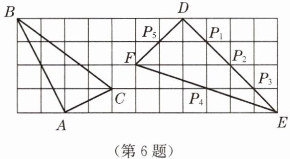 6. 如图,在边长为 $1$ 的小正方形组成的网格中,$△ ABC$ 和 $△ DEF$ 的顶点都在格点上,$P_1$,$P_2$,$P_3$,$P_4$,$P_5$ 是 $△ DEF$ 边上的 $5$ 个格点,请按要求完成下列各题。