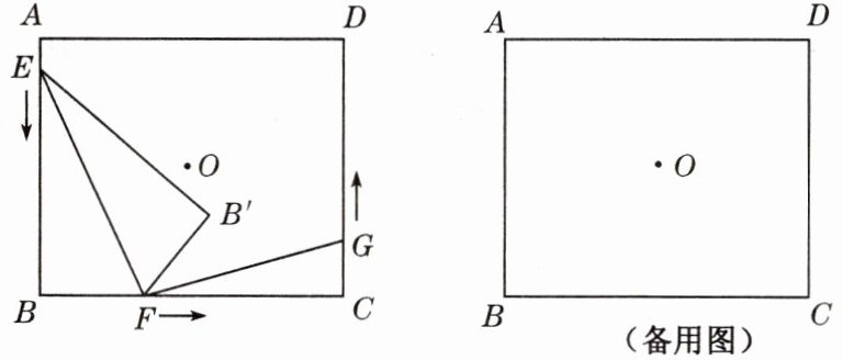 如图,点 $O$ 为矩形 $ABCD$ 的对称中心,$AB = 10\ cm$,$BC = 12\ cm$,点 $E$,$F$,$G$ 分别从 $A$,$B$,$C$ 三点同时出发,沿矩形的边按逆时针方向匀速运动,点 $E$ 的运动速度为 $1\ cm/s$,点 $F$ 的运动速度为 $3\ cm/s$,点 $G$ 的运动速度为 $1.5\ cm/s$,当点 $F$ 到达点 $C$(即点 $F$ 与点 $C$ 重合)时,三个点随之停止运动。在运动过程中,$△ EBF$ 关于直线 $EF$ 的对称图形是 $△ EB'F$。设点 $E$,$F$,$G$ 运动的时间为 $t$(单位:$s$)。