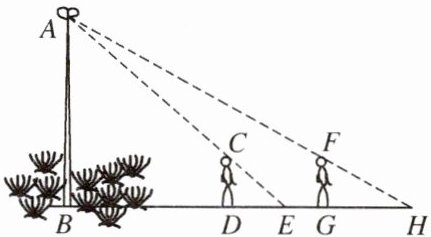同理,$ AB ⊥ BH $,$ FG ⊥ BH $,$ ∠ AHB = ∠ FHG $,故$ △ ABH ∼ △ FGH $。根据相似三角形性质得:$\frac{AB}{FG} = \frac{BH}{GH}$,其中$ BH = BD + DG + GH = x + 5 + 5 = x + 10 $,即$\frac{h}{1.7} = \frac{x + 10}{5}$。②