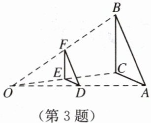 3. 如图,按如下方法将 $ △ ABC $ 的三边缩小为原来的 $ \frac{1}{2} $,任取一点 $ O $,连接 $ AO $,$ BO $,$ CO $,并取它们的中点 $ D $,$ F $,$ E $,得 $ △ DFE $,有下列说法:(1)$ △ ABC $ 与 $ △ DFE $ 是位似图形;(2)$ △ ABC $ 与 $ △ DFE $ 是相似图形;(3)$ △ ABC $ 与 $ △ DFE $ 周长的比为 $ 2:1 $;(4)$ △ ABC $ 与 $ △ DFE $ 面积的比为 $ 4:1 $. 其中正确的个数是(