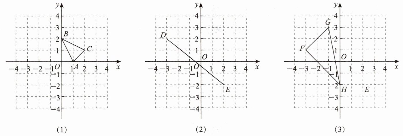 答案:4. (1) 图略,$A_{1}(0, -5), B_{1}(3, -4), C_{1}(2, -2)$,即横坐标不变,纵坐标减3; (2) 图略,$A_{2}(0, -2), B_{2}(-3, -1), C_{2}(-2, 1)$,即纵坐标不变,横坐标变为原来的相反数; (3) 图略,$A_{3}(0, -4), B_{3}(6, -2), C_{3}(4, 2)$;或$A_{3}(0, 4), B_{3}(-6, 2), C_{3}(-4, -2)$,即横坐标、纵坐标都乘2或-2.