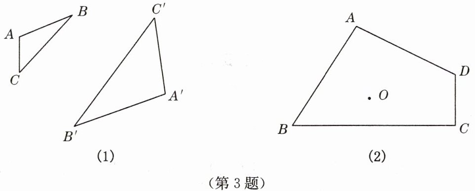 3. (1)如图(1),$ △ ABC $ 与 $ △ A'B'C' $ 是位似图形,且位似比是 $ 1:2 $. 若 $ AB = 2\ \mathrm{cm} $,则 $ A'B' = $