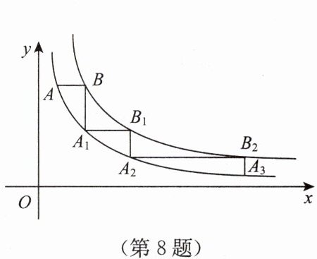 8. 如图,在平面直角坐标系的第一象限中,$ y_1 = \frac{4}{x} $ 和 $ y_2 = \frac{8}{x} $,点 $ A(1,a) $ 在 $ y_1 = \frac{4}{x} $ 上,$ AB // x $ 轴交 $ y_2 = \frac{8}{x} $ 于点 $ B $,$ BA_1 // y $ 轴交 $ y_1 = \frac{4}{x} $ 于点 $ A_1 $,$ A_1B_1 // x $ 轴交 $ y_2 = \frac{8}{x} $ 于点 $ B_2 $,$···$,按照此规律作图,则点 $ B_2 $ 的坐标为
