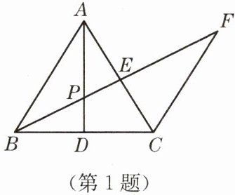 1. 如图,在 $ △ABC $ 中,$ AB = AC $,$ AD $ 是中线,$ P $ 是 $ AD $ 上一点。过 $ C $ 作 $ CF // AB $,延长 $ BP $ 交 $ AC $ 于 $ E $,交 $ CF $ 于 $ F $。试证明:$ BP^2 = PE · PF $。