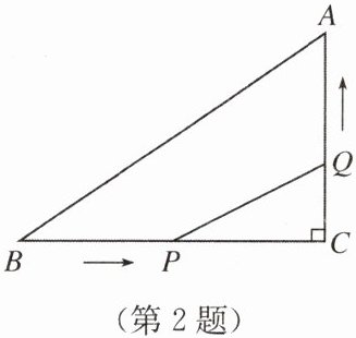 2. 如图,在 $ △ABC $ 中,$ ∠C = 90° $,$ BC = 8 \mathrm{ cm} $,$ AC:BC = 3:4 $,点 $ P $ 从点 $ B $ 出发,沿 $ BC $ 向点 $ C $ 以 $ 2 \mathrm{ cm/s} $ 的速度移动,点 $ Q $ 从点 $ C $ 出发,沿 $ CA $ 向点 $ A $ 以 $ 1 \mathrm{ cm/s} $ 的速度移动。如果 $ P $,$ Q $ 分别从 $ B $,$ C $ 同时出发,当点 $ P $ 到达点 $ C $ 时,点 $ Q $ 随即停止运动。经过多少秒时以 $ C $,$ P $,$ Q $ 为顶点的三角形恰与 $ △ABC $ 相似?