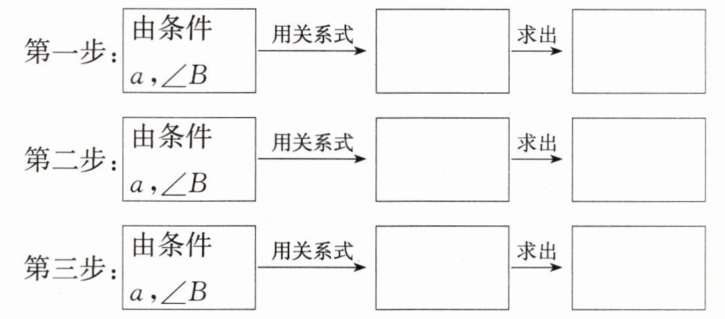 (1)第一步:关系式∠A=90°-∠B,求出∠A;第二步:关系式b=a·tan∠B,求出b;第三步:关系式c=a/cos∠B,求出c。