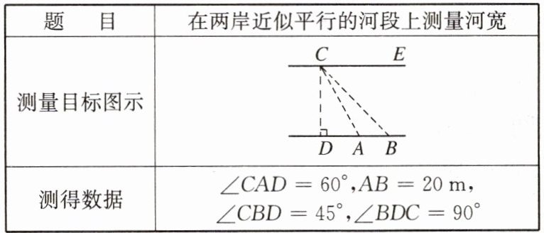 5. 下表是小明同学填写实习报告的部分内容,请你根据以下的条件,计算出河宽CD(结果保留根号).