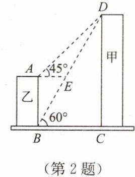 2. 如图,甲、乙为两座建筑物,它们之间的水平距离BC为30 m,在A点测得D点的仰角∠EAD为45°,在B点测得D点的仰角∠CBD为60°,则乙建筑物的高度为