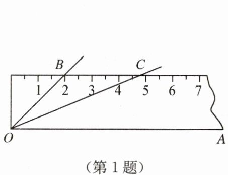 1. 如图,将45°的∠AOB按下面的方式放置在一把刻度尺上:顶点O与尺下沿的端点重合,OA与尺下沿重合,OB与尺上沿的交点B在尺上的读数恰为2 cm,若按相同的方式将22.5°的∠AOC放置在该刻度尺上,则OC与尺上沿的交点C在尺上的读数为