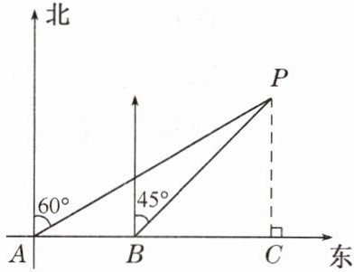 问题 如图,大海中某灯塔P周围10 n mile范围内有暗礁,一艘海轮在点A处观察灯塔P在北偏东60°方向,该海轮向正东方向航行8 n mile到达点B处,这时观察灯塔P恰好在北偏东45°方向.如果海轮继续向正东方向航行,会有触礁的危险吗?试说明理由(参考数据:√3≈1.73).