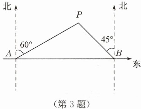 3. 如图,在东西方向的海岸线上有A,B两个港口,甲货船从A港沿北偏东60°的方向以4 n mile/h的速度出发,同时乙货船从B港沿西北方向出发,2 h后相遇在点P处,则乙货船每小时航行