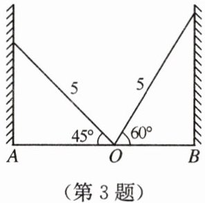 3. 如图,学校的保管室里,有一架5 m长的梯子斜靠在墙上,此时梯子与地面所成角为45°;如果梯子底端O固定不动,顶端靠到对面墙上,此时梯子与地面所成的角为60°,则此保管室的宽度AB为