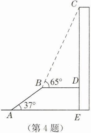 4. 如图,AB是长为5 m,倾斜角为37°的自动扶梯,平台BD与大楼CE垂直,且与扶梯AB的长度相等,在B处测得大楼顶部C的仰角为65°,求大楼CE的高度(结果保留整数).(参考数据:sin37°≈$\frac{3}{5}$,tan37°≈$\frac{3}{4}$,sin65°≈$\frac{9}{10}$,tan65°≈$\frac{15}{7}$)