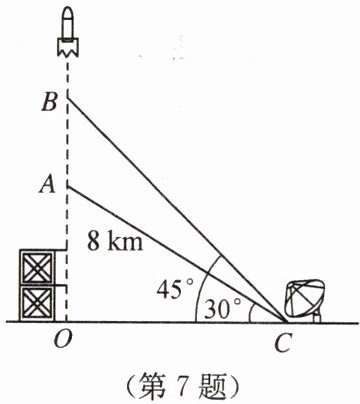 7. 2024 年 10 月 30 日 04 时 27 分,“神舟十九号” 载人飞船在中国酒泉卫星发射中心点火发射,成功把蔡旭哲、宋令东、王浩泽三名航天员送入到中国空间站。如图,在发射的过程中,飞船从地面 $ O $ 处发射,当飞船到达 $ A $ 点时,从位于地面 $ C $ 处的雷达站测得 $ AC $ 的距离是 $ 8 \, \mathrm{km} $,仰角为 $ 30° $;$ 10 \, \mathrm{s} $ 后飞船到达 $ B $ 处,此时测得仰角为 $ 45° $。