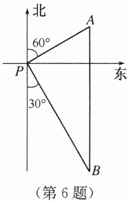 6. 如图,一艘轮船位于灯塔 $ P $ 的北偏东 $ 60° $ 方向上的 $ A $ 处,它沿正南方航行 $ 70 \, \mathrm{km} $ 后,到达位于灯塔 $ P $ 的南偏东 $ 30° $ 方向上的 $ B $ 处,这时,轮船所在的 $ B $ 处与灯塔 $ P $ 的距离是