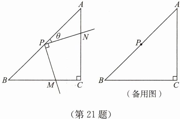 21. (10 分)如图,在$Rt△ ABC$中,$AC = BC = 4$,$∠ C = 90^{\circ}$,点$P$是边$AB$中点,$∠ MPN = 90^{\circ}$,$∠ APN = θ$。