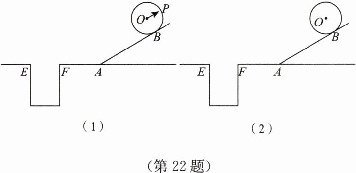 22. (12 分)有一个圆球(球心为点$O$),从一个斜坡沿最短路径向下滚动,最终落在左侧的圆柱形坑的坑口上,其示意图如图(1)所示,点$B$是圆球与坡面的切点。已知坡面与水平面的夹角是$30^{\circ}$,球的半径是$\sqrt{3}$。