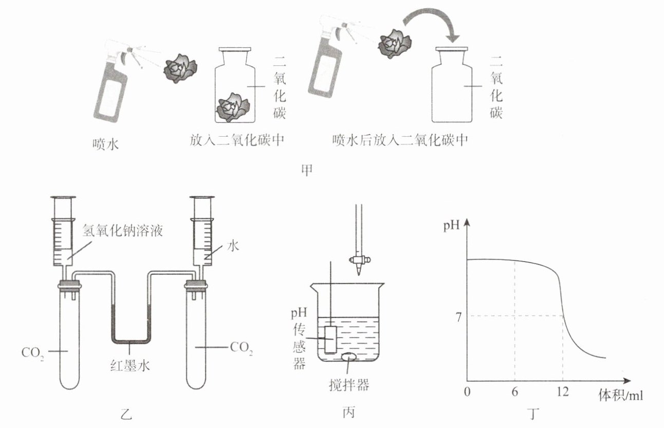 (1)实验一:取三朵用石蕊溶液染成紫色的干燥纸花进行图甲所示实验,该实验证明CO₂与H₂O发生了反应是根据思维模型