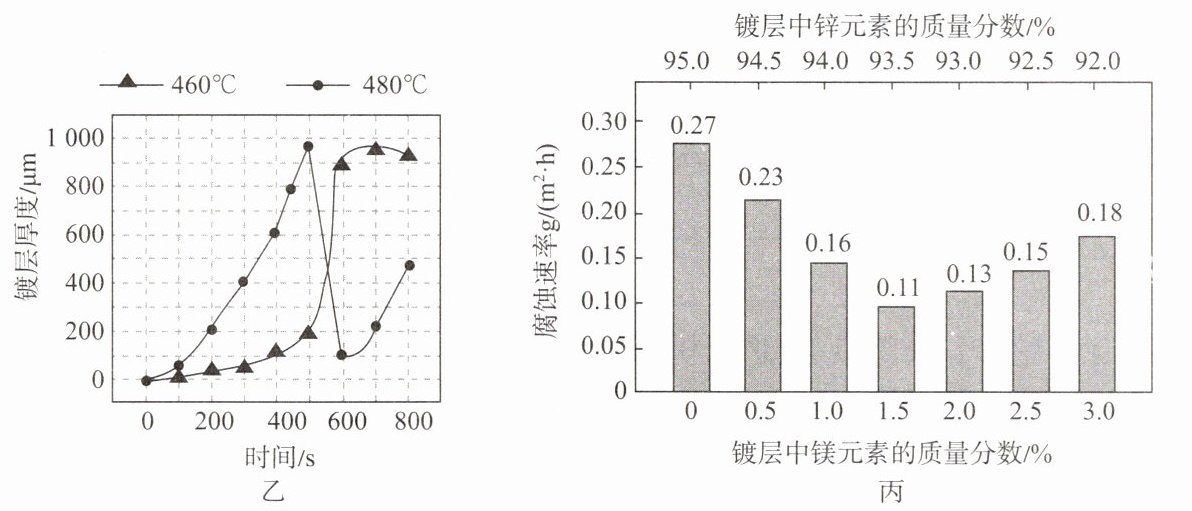 ①在锌铝镀层中加入适量镁可调节镀层的耐腐蚀性能。取含铝的质量分数为5%的Zn、Al、Mg镀层测试镀层腐蚀速率的结果如图丙所示,镀层的腐蚀速率随镀层中不同Zn、Mg质量分数变化的规律是