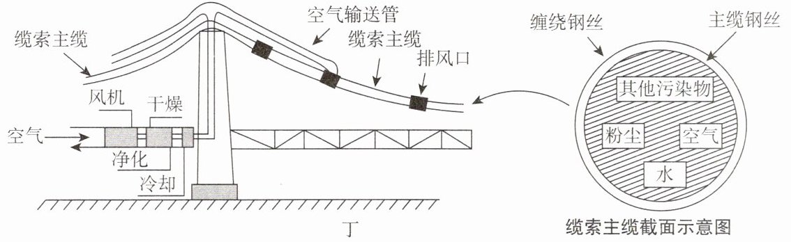 ②某桥梁主缆采用锌铝镁钢丝,工程师为了缆索主缆不被腐蚀,设计了桥梁干燥系统,如图丁所示。说明缆索主缆的防护原理: