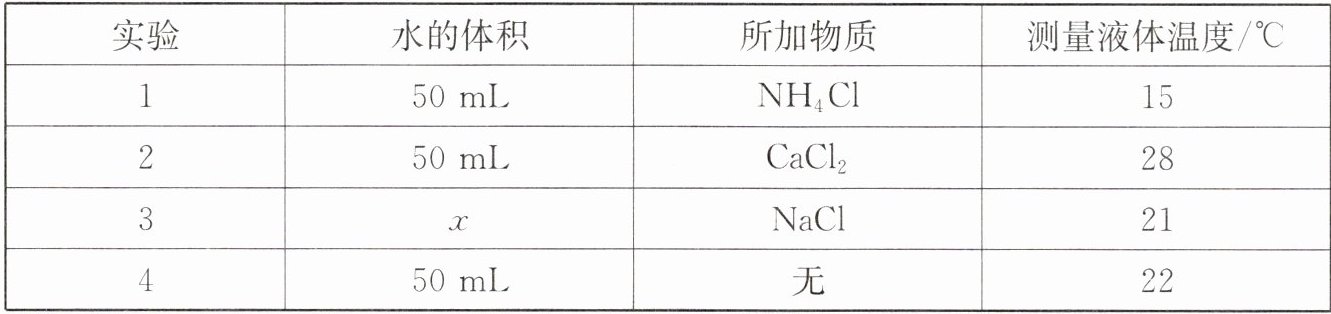 三种物质各取 1 药匙于烧杯中并分别溶于水,另还有一个烧杯只加水,用温度计测量液体温度,并记录有关数据如下: