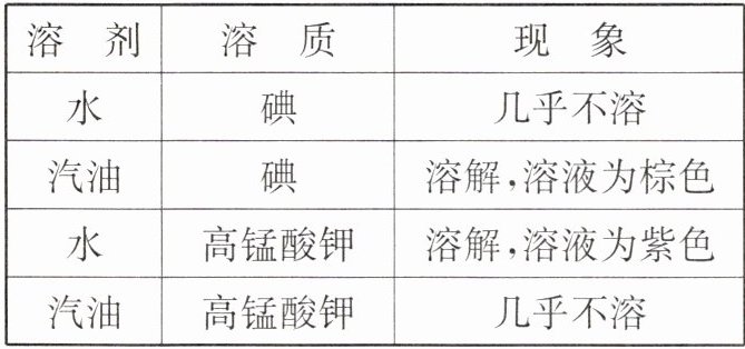 9. 在两支试管中各加入 2~3 mL 水,分别加入 1~2 小粒碘或高锰酸钾,振荡,观察现象。然后再向两支试管中分别加入 1 mL 汽油,振荡,静置,观察现象。记录如表所示。
