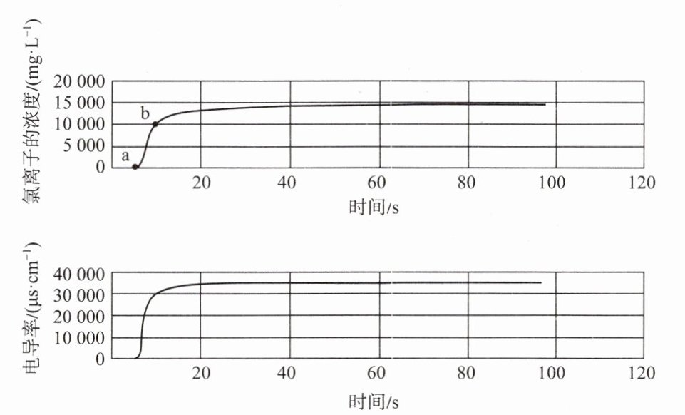 第三步,用氯离子传感器和电导率传感器同时采集数据,迅速将一定质量的氯化钠加入烧杯中。实验结果如图所示。