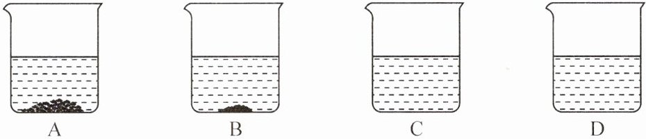 5. A、B、C、D 四个烧杯中分别盛有相同质量的水,在温度相同的条件下,向四个烧杯中分别加入$ 20\ g $、$ 15\ g $、$ 10\ g $、$ 5\ g $某物质,充分溶解后观察到如图所示的现象。请回答下列问题: