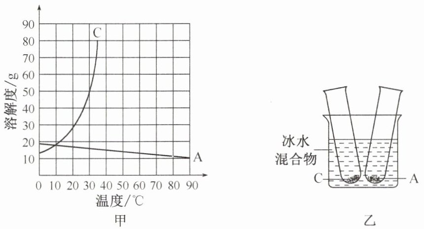 (4)如图乙所示,常温下分别向装有适量 A、C 物质的两支试管里加入等量蒸馏水,充分振荡后,两支试管底部均有未溶解的固体。再将两支试管放入盛有冰水混合物的烧杯中,看到的实验现象是:装 C 物质的试管中固体增多,装 A 物质的试管中固体减少。请你对此现象做出解释: