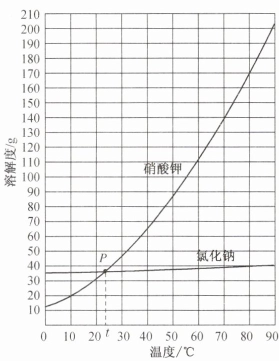 ② t℃时,图中 P 点所示的硝酸钾和氯化钠的两种溶液,前者与后者的溶质的质量分数的大小关系为