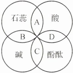 1. 小李在学习酸碱指示剂与常见酸性、碱性溶液作用时,归纳出如图所示的关系。图中A、B、C、D是两圆相交的部分,分别表示指示剂与酸性、碱性溶液作用时所显示出的颜色,则其中表示不正确的是(