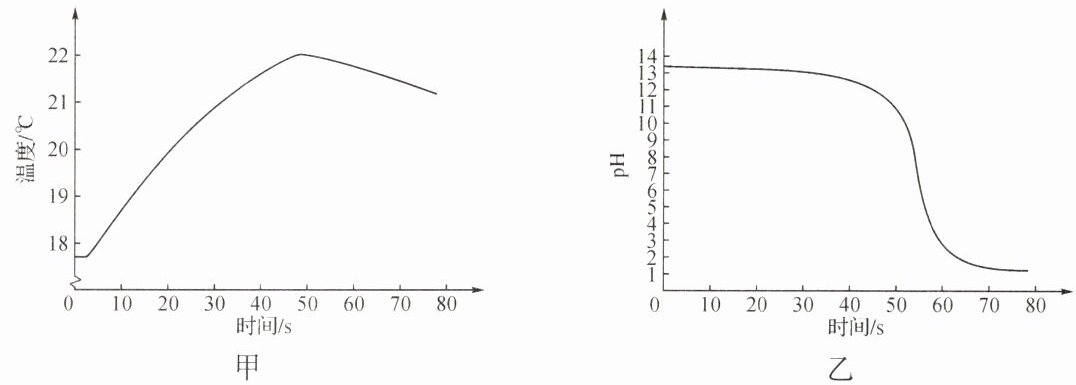 ② 将稀盐酸逐滴匀速加入一定量的稀氢氧化钠溶液中,用数字化仪器对反应过程中溶液的温度、pH进行实时测定,得到的曲线如图甲、乙所示。