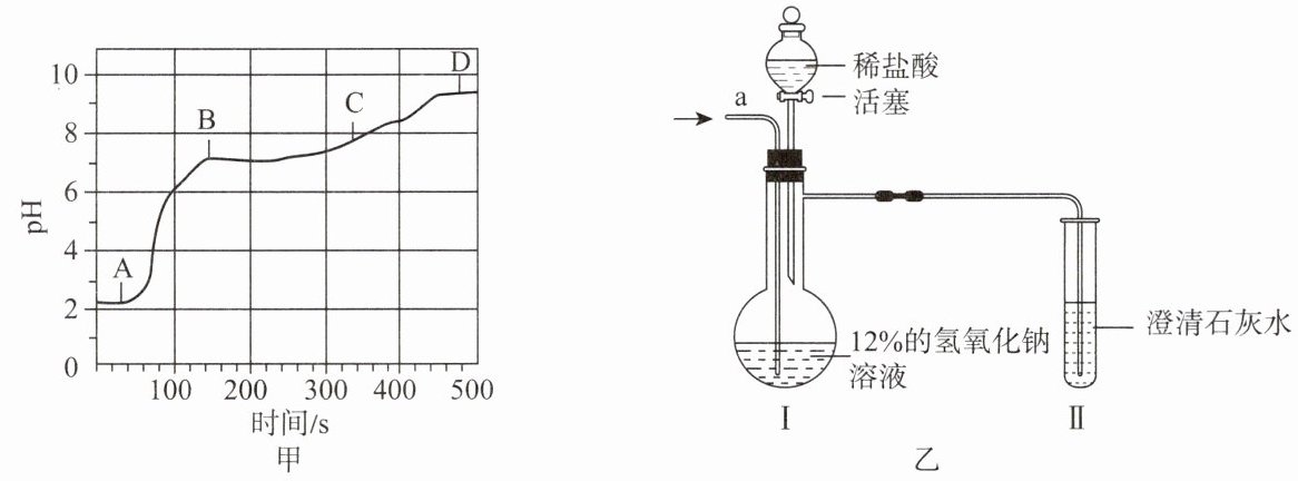 (4)向上述(1)反应后的 A 烧杯中滴加碳酸钠溶液,测得其 pH 随反应时间的变化如图甲所示。AB 段的实验现象是