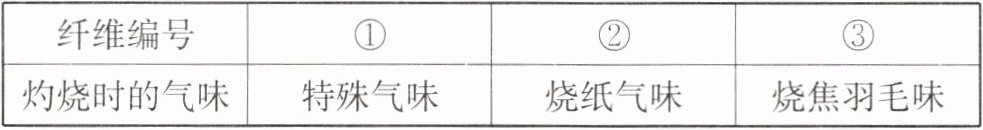 应用 我们穿的衣服通常是由纤维织成的,常见的纤维有棉花、羊毛、涤纶等。小明灼烧棉花、羊毛、涤纶三种纤维得到下列气味,则棉花、羊毛的编号分别为(
