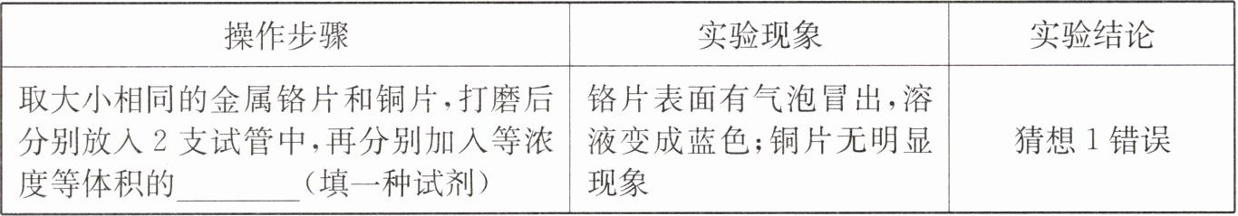 [提出猜想1] 依据铬不易生锈,猜想两种金属的活动性:${Cu > Cr}$。