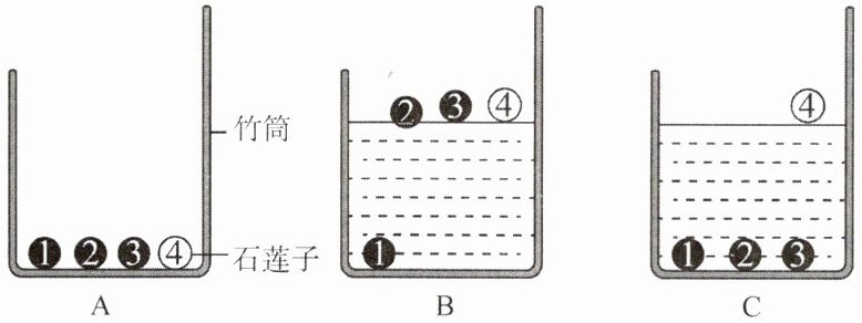 ③ 莲管秤中的$1~4$号石莲子的密度依次减小。现将两份卤水分别倒入莲管秤中,观察到石莲子的沉浮情况如图$B$和图$C$所示,对应的卤水浓度较大的是