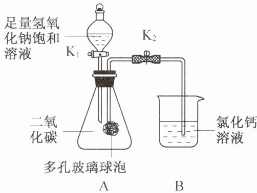 (1)打开$K_{1}$,将分液漏斗中的溶液全部注入锥形瓶内,立即关闭$K_{1}$,观察到有少量白色浑浊产生。查找原因,产生该异常现象是因为氢氧化钠饱和溶液中混入了氢氧化钙,产生白色浑浊的一个反应的化学方程式为