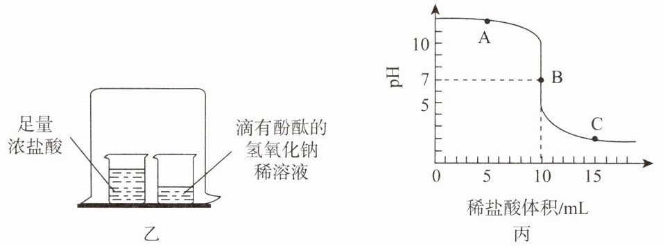 数字化实验:用$pH$传感器测定向稀氢氧化钠溶液中滴入稀盐酸过程中$pH$的变化。测定结果如图丙所示。