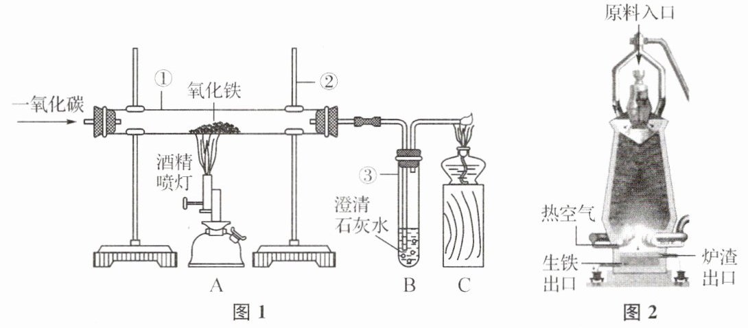 答案:问题1 要点:2 高炉 赤铁矿石 焦炭 石灰石 应用:(1)硬质玻璃管(或玻璃管) 铁架台 (2)$\mathrm{Fe_2O_3 + 3CO \overset{高温}{=} 2Fe + 3CO_2}$ 澄清石灰水变浑浊 (3)处理尾气,防止有毒的一氧化碳逸出污染空气 (4)⑤①③④② (5)和$\mathrm{CO_2}$反应生成$\mathrm{CO}$作还原剂 炉渣的密度小于生铁的密度 (6)固体部分溶解,产生气泡,溶液由无色变为浅绿色 $\mathrm{Fe + 2HCl = FeCl_2 + H_2 \uparrow}$ C