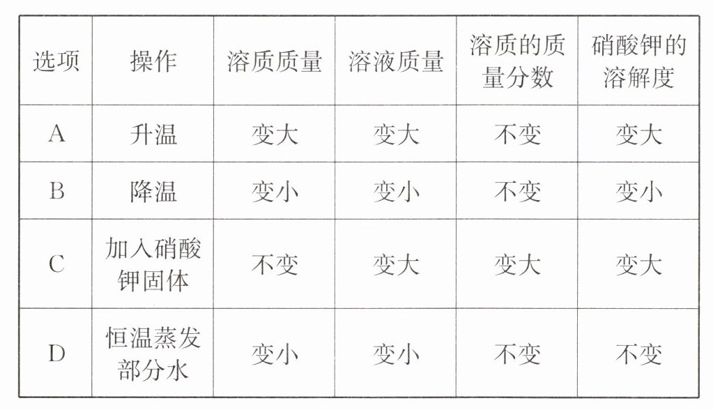选项C:加入硝酸钾固体,原溶液已饱和,不能继续溶解,溶质质量、溶液质量、溶质质量分数均不变,溶解度不变,C错误。
