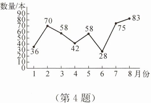 4. 班长统计去年1~8月“书香校园”活动中全班的课外书阅读数量(单位:本),绘制了折线统计图(如图). 下列说法中,正确的是(