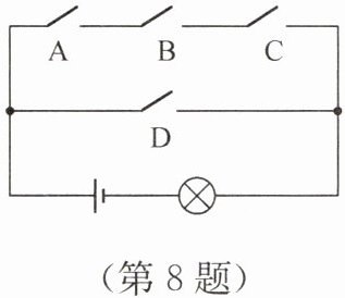 8. 如图,电路上有A、B、C、D四个开关和一个灯泡,闭合开关D或同时闭合开关A、B、C,都能使小灯泡发光.