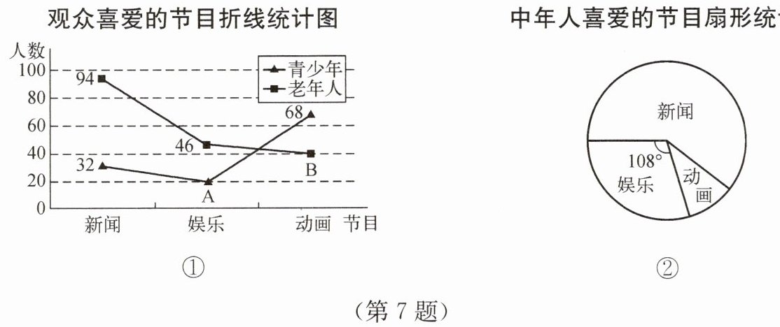 7. 为了解某地区30万电视观众对新闻、动画、娱乐三类节目的喜爱情况,按老年人、中年人、青少年各年龄段实际人口的比例3∶5∶2,随机抽取一定数量的观众进行调查,得到如下统计图.