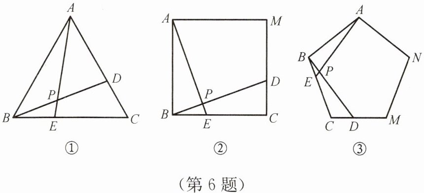 6. 如图①、②、③中,$ E、D $分别是正三角形$ ABC $、正四边形$ ABCM $、正五边形$ ABCMN $中$ \angle C $的两边上的点,且$ BE = CD $,$ DB $与$ AE $相交于点$ P $.