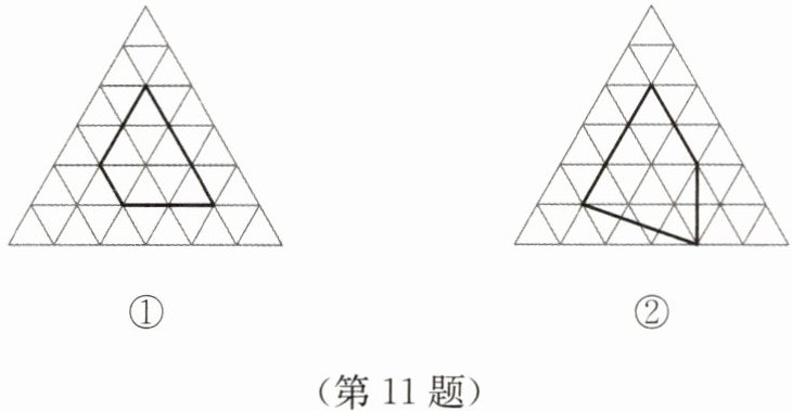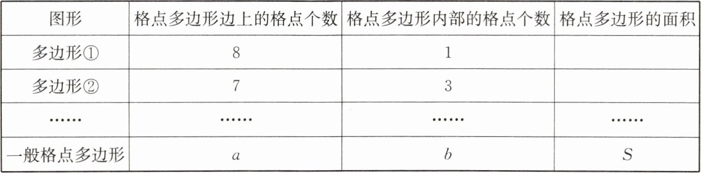 11. 在单位面积为 1 的正方形网格中任意画一个格点多边形,若该多边形各边上的格点个数和为 $ a $,内部的格点个数为 $ b $,则该多边形的面积 $ S=\frac{1}{2}a + b - 1 $(“皮克公式”).