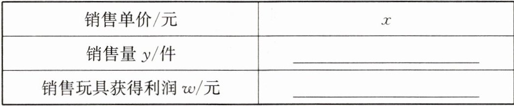 (1) 设该种玩具的销售单价为 $ x $ 元 $ (x > 40) $,请你分别用含 $ x $ 的代数式来表示销售量 $ y $(件)和销售该种玩具获得利润 $ w $(元),并把结果填写在表格中:
